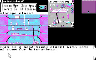 After Zenic made me aware that I’d missed a vital item (a gold amulet) on the first screen of the game (which you can never go back to), I started Uninvited again and set off more determined than ever to figure out its mysteries. It didn’t take me long to get back to where I was previously, since I’d already mapped every location I’d visited and hadn’t actually achieved very much. I then set about mapping the rest of the house and checking out all the items in each room, guessing as to which ones might have a role to play later on. One thing I did come across that I figured I could do something with was a spider on the veranda. I just so happened to have some spider spray in my inventory, which paralysed the arachnid, allowing me to carry it with me in a live state. Once I’d mapped every room I had access to, I set about re-reading the various books and parchments I’d collected to see if I could find some sort of hint about what I needed to do next. At this stage there were three rooms I couldn’t get access to (the Magisterium, the Chapel and a room off the study) and two locked cabinets (one in the rec room, another in the master bedroom), but everything else was accessible.