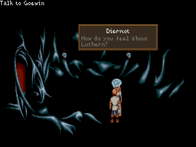 | It’s a visual metaphor, see? Diermot represents the player and the Skorl is the game. |