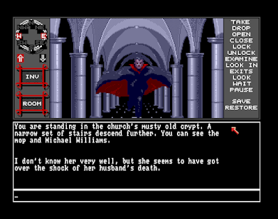 I suspect the Amiga version in an Amiga emulator is better in some places, but I'm not eager to play a three disk game all the way through when loading happens on nearly every screen transition. It's very, very slow in general. I had so much trouble just dealing with the vampire that I can't imagine actually playing a full game of this. This, ironically enough, answers one of my questions. The Michael Williams character who completely disappeared was in fact the vampire. This brings up the question of what the hell did I see when I thought I saw him walking around? I don't remember finding the garlic then. Also, that's a very different image than his walking around gear...