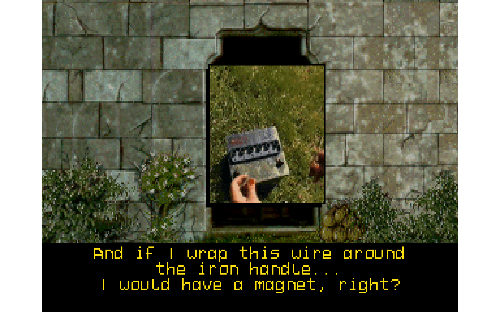 Now, I’m able to combine more inventory items. And I’m confused. It seems I’ve acquired an inventory item at some point, which I don’t remember picking up. It’s a wire. I replayed what I’ve done, and figured out that after I put the portrait into the steps below the elevator, I must have removed the wire it was hanging from and kept it. But the game never mentioned it, animated it, or otherwise made me aware that part of the portrait was kept in reserve.