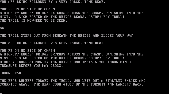 The first case is actually rather good puzzle, at least once you know how the magic words work. At one point the player arrives at a room of giant proportions with a large nest containing golden eggs. On the wall of this room one can read the words “Fee”, “Fie”, “Foe” and “Foo”. Saying these words does not make the player move anywhere else, but it does make the eggs return to the nest, if they are out of it. How does this help? Well, the player will later on meet a bridge guarded by a troll, who won’t let anyone through, unless they forfeit a treasure. The obvious trick is to give the eggs to the troll and then say the magic words to make them return to their nest.