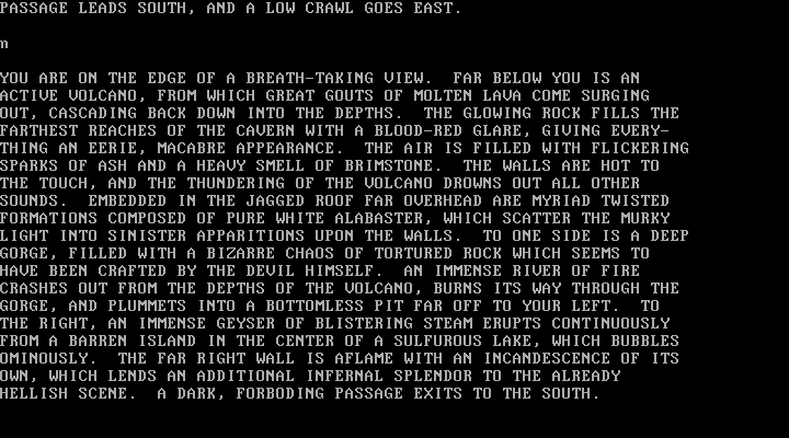 While the description of overland rooms is nothing out of the ordinary, in the cave system Crowther's expertise on the topic becomes evident – I have no idea what a frozen river of orange stone looks like, but it sure sounds like coming from a person knowing his geology. Some rooms, evidently added by Woods, have more fanciful features. For instance, in two rooms you see a shadowy figure waving to you through a window - later you’ll learn that these rooms overlook a huge canyon containing an enormous two-sided mirror.