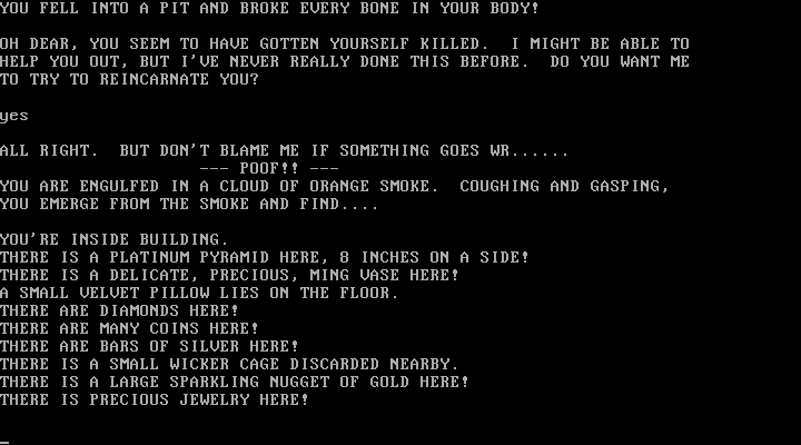 Compared to later Infocom games the two-word parser makes the puzzles somewhat easier. With Infocom games the player would be expected to write down exactly where the bird is to put, but in Adventure holding a cage and picking up the bird is enough. Similarly, the player is not meant to tell, which tool he should use for opening an oyster, it suffices that he is just carrying the right item. An interesting twist on this theme is the use of a pillow - you will find a delicate vase, dropping of which leads to its shattering, unless the room contains a pillow, on which the vase is then dropped.