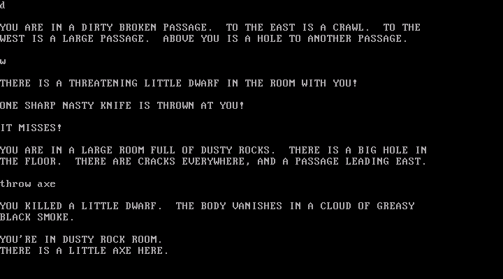 The program recreated geography of a part of the so-called Bed Quilt Cave of the Mammoth Cave System. For a long time, it was thought that Crowther’s original program was nothing more than that - a mere guided tour through a cave system. When the original code of Crowther was discovered in 2005, it became clear that this first stage of Adventure was something more. It had obvious D&D influences, like magic words and little dwarves running around, but most importantly, it already had puzzles and was thus a primitive adventure game. Yet, it was also clearly unfinished and had no proper ending.